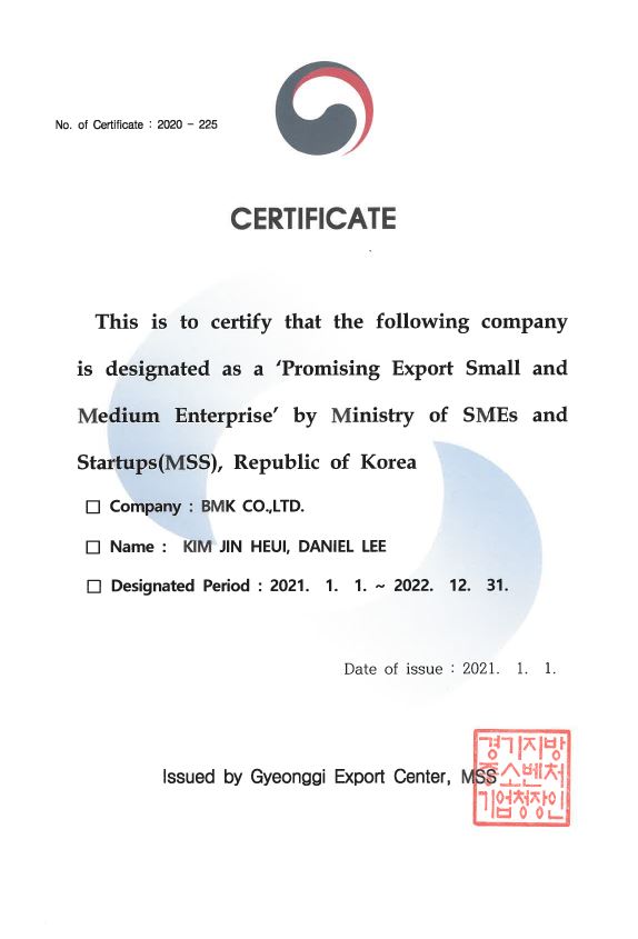 Promising Export Small and Medium Enterprise 페이지 정보 작성자 비엠케이 작성일21-01-22 10:56 조회3,224회 관련링크 이전글 다음글 목록 본문 'Promising Export Small and Medium Enterprise' by Ministry of SMEs and Startups(MSS), Republic of Korea 이전글 다음글 목록